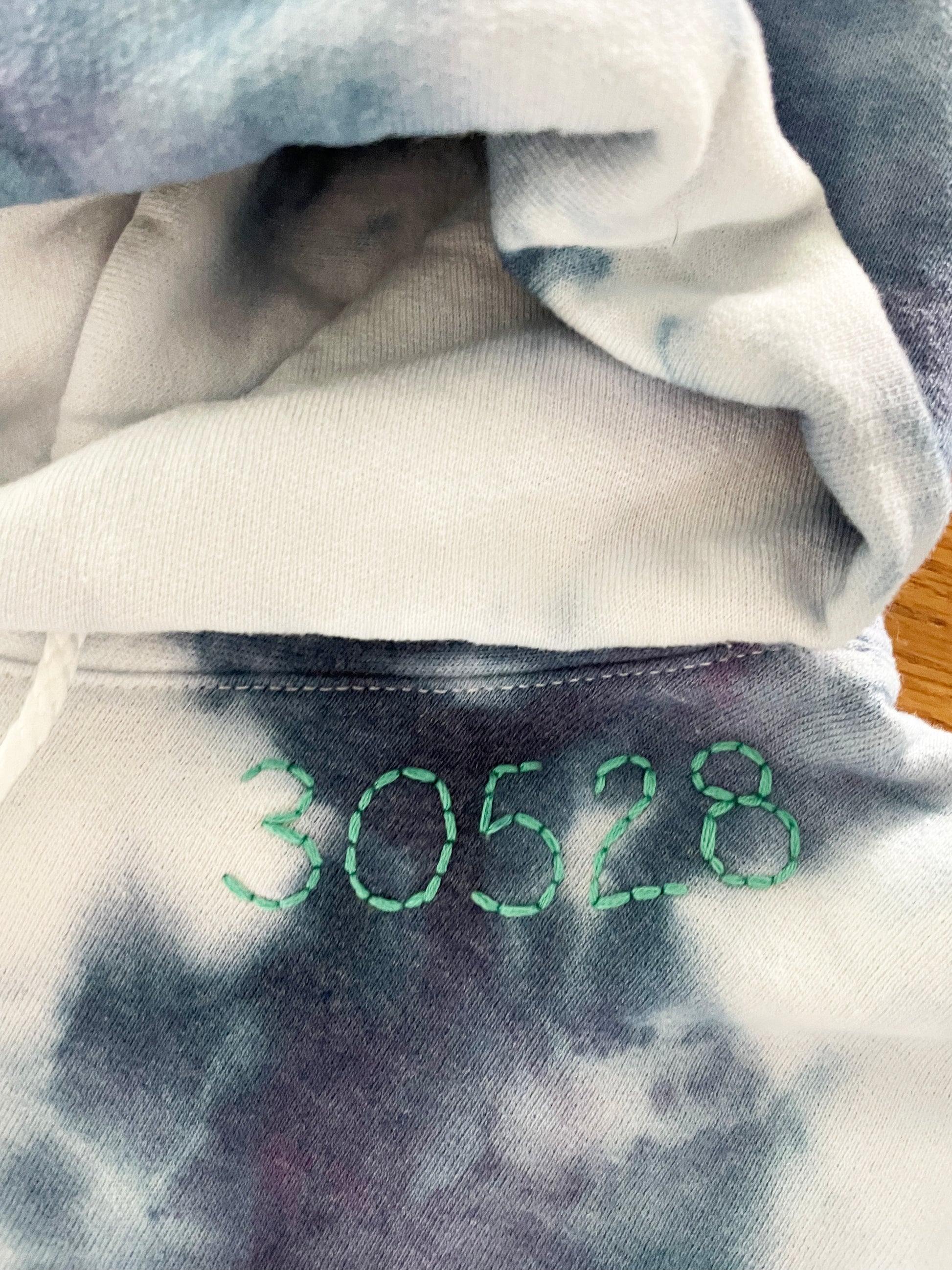 Sweatshirt comes with a zip code stitched in one location and one additional location (x's on pocket, initials on wrist, etc). Choose your dye color, thread colors and location of embroidery.